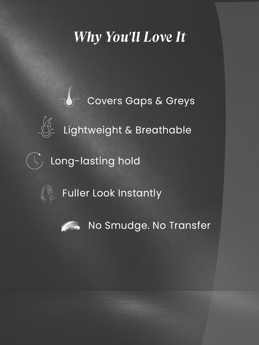 1. Instant Hair Coverage : Fills in thinning areas, bald spots, and visible scalp with a soft matte finish that blends perfectly with your natural hair.