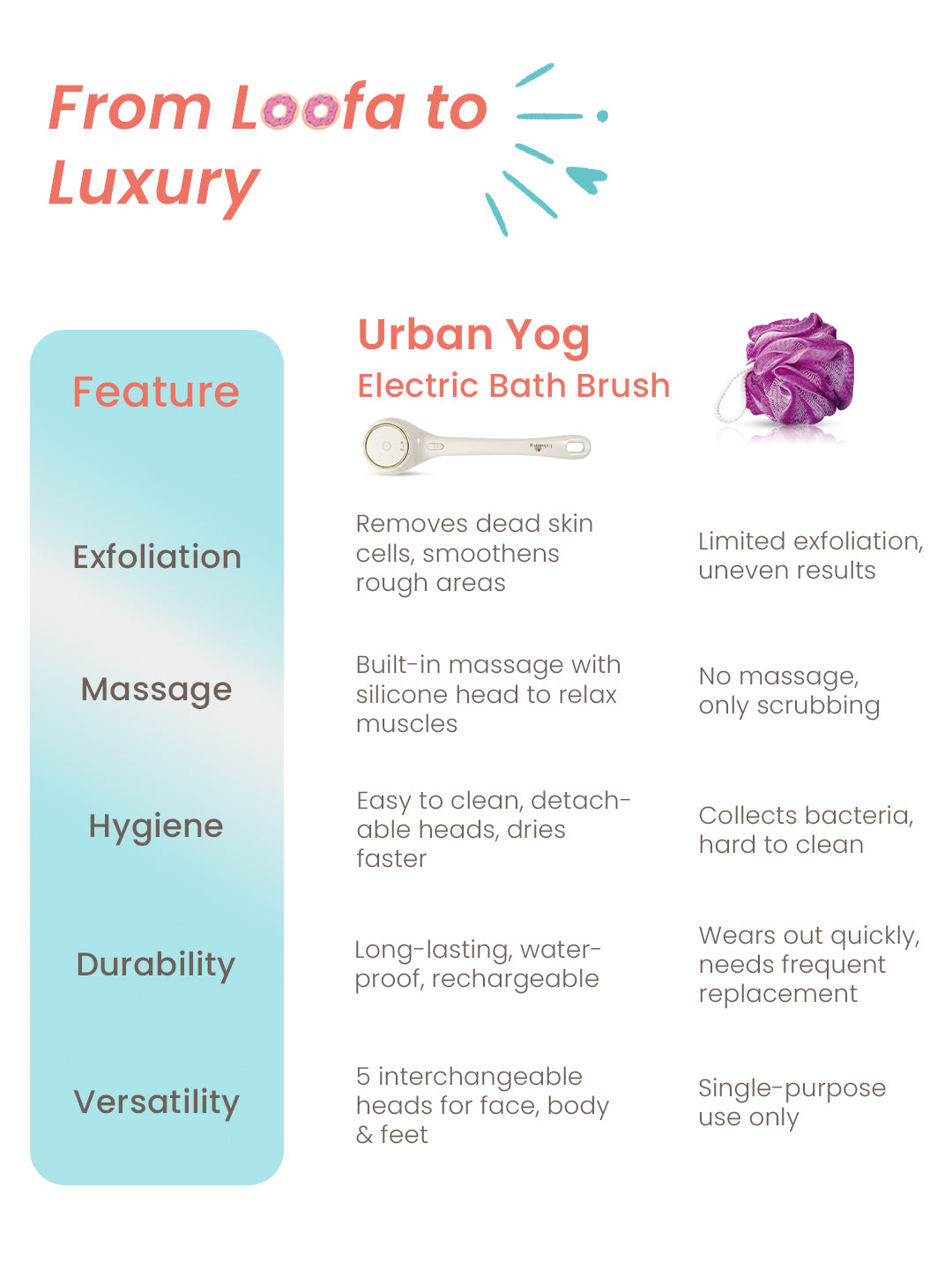 The Urban Yog Electric Bath Brush is designed to enhance your bathing routine with gentle yet effective cleansing. Its rotating brush head helps exfoliate dead skin cells, promoting smoother and healthier skin. Ergonomically crafted for comfortable grip and easy handling, this electric bath brush is suitable for daily use, improving circulation and leaving your skin refreshed and revitalized.